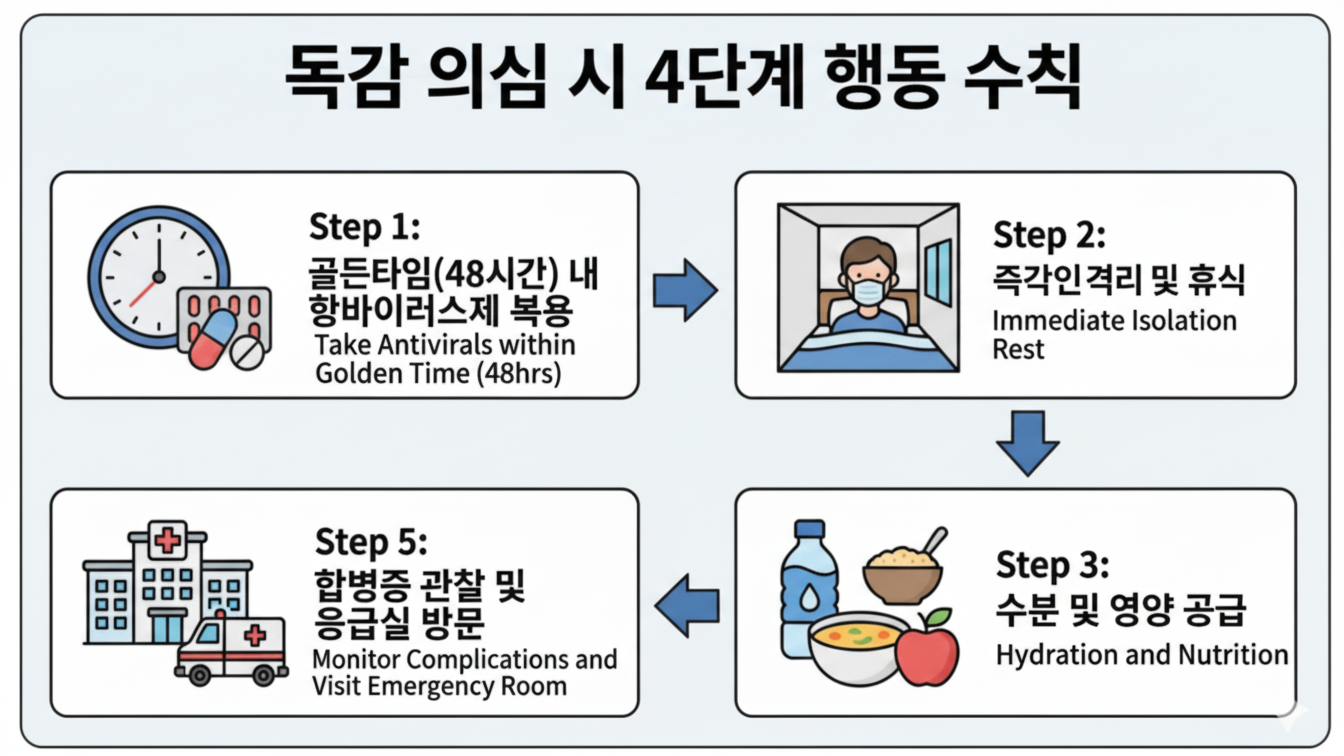 Step 1. 골든타임 사수 (48시간 이내): 증상 발생 후 48시간 이내에 항바이러스제(타미플루 등)를 복용해야 치료 효과가 가장 좋습니다.
