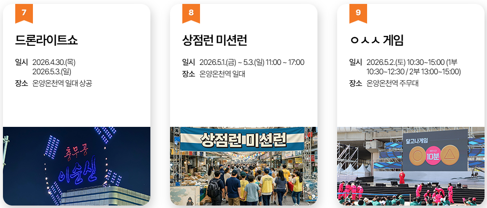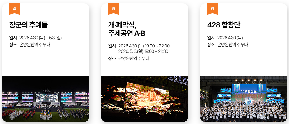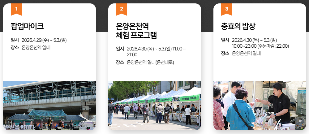 * 팁: 축제 기간에는 교통이 매우 혼잡하므로 대중교통(지하철 1호선 온양온천역)을 이용하시거나 행사장에서 조금 떨어진 임시 주차장에 차를 세우고 셔틀버스를 타시는 것이 정신 건강에 좋습니다!